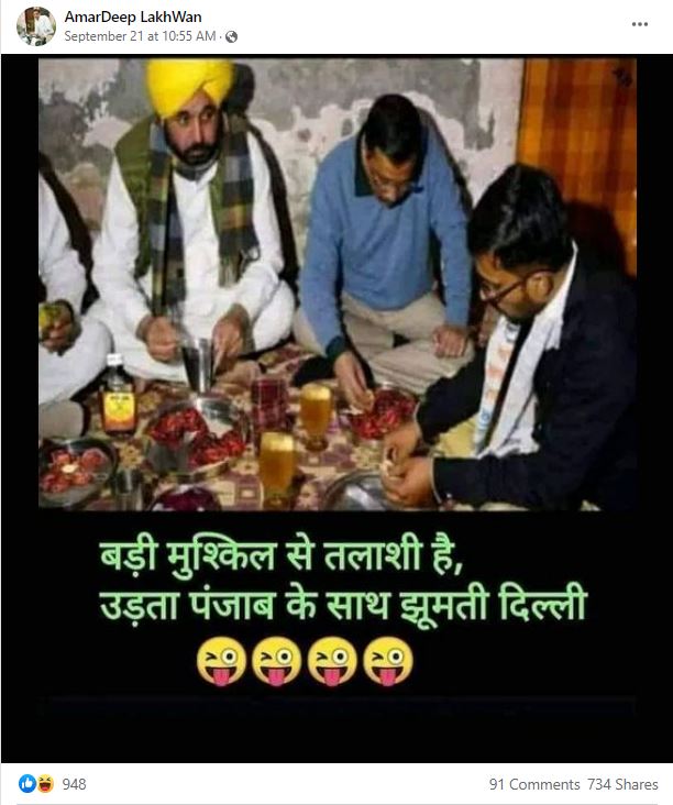 असल तस्वीर हमें आम आदमी पार्टी के ट्विटर हैंडल से 22 नवंबर 2021 को किए गए एक ट्वीट में भी मिला। इसमें भी बताया गया है कि केजरीवाल और भगवंत मान पंजाब के ऑटो ड्राइवर के निमंत्रण पर उसके घर भोजन करने पहुंचे थे।