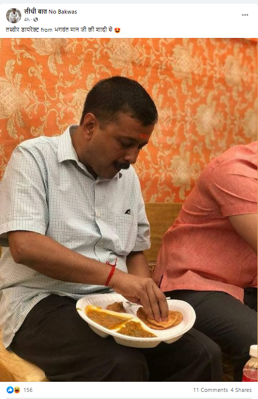 दिल्ली के मुख्यमंत्री अरविंद केजरीवाल की भोजन करते हुए एक तस्वीर शेयर कर इसे पंजाब के सीएम भगवंत मान की आज हुई दूसरी शादी समारोह का बताया जा रहा है।