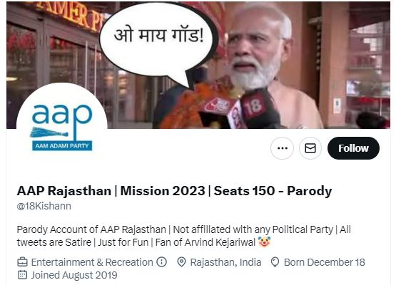 हमने इस ट्विटर अकाउंट के बायो को चेक किया। इसमें लिखा है कि यह राजस्थान ‘आप’ का एक पैरोडी अकाउंट है और इसका किसी राजनीतिक पार्टी से जुड़ाव नहीं है।