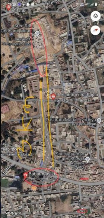 गूगल मैप के वायरल स्क्रीनशॉट में एक जगह पर बाबर मस्जिद परिसर को पिन किया गया है और थोड़ी दूर पर रामजन्मभूमि मंदिर अयोध्या को टैग कर यह दिखाने की कोशिश की गई है कि दोनों में करीब 3 किलोमीटर की दूरी है.