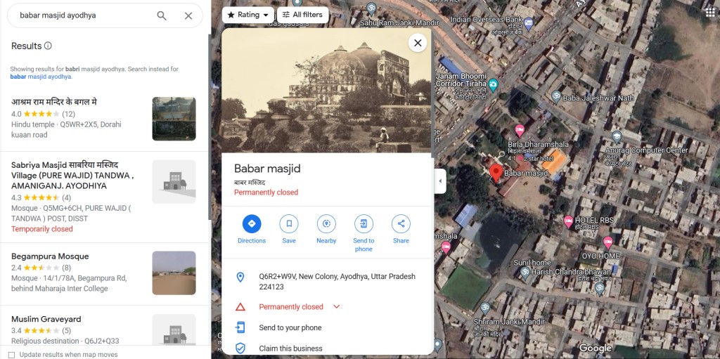 इस दौरान हमने यह भी पाया कि किसी ने उक्त जगह के रिव्यू सेक्शन में बाबरी मस्जिद की फोटो गलत तरीके से अपलोड कर दी है, जिससे लोग उसे बाबरी मस्जिद समझ रहे हैं.