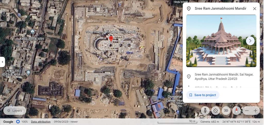 जांच में हमने गूगल अर्थ प्रो की भी मदद ली. इस दौरान वहां मिली सेटेलाइट फोटो, जो 2023 में ली गयी थी उसमें निर्माणाधीन राम मंदिर देखा जा सकता है.