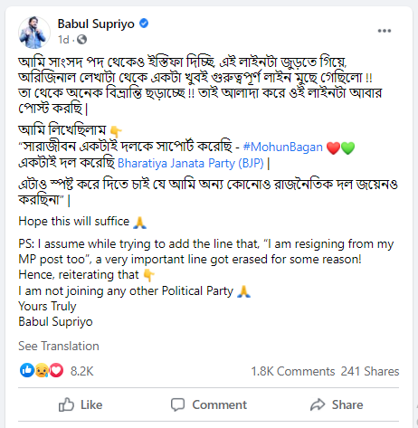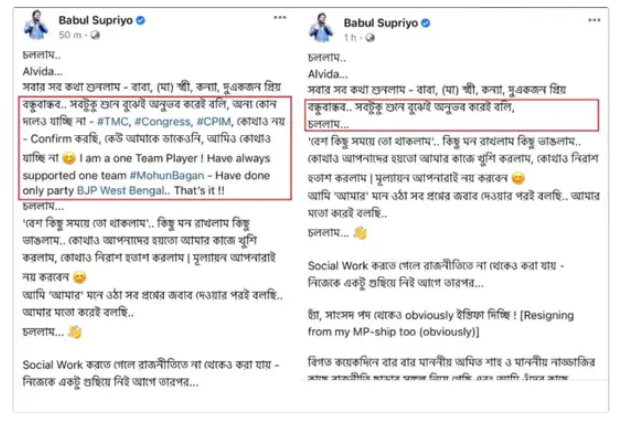बाबुल ने पोस्ट में आगे लिखा था, मैं किसी भी पार्टी में नहीं जा रहा हूं और मैं हमेशा बीजेपी का सदस्य रहूंगा। लेकिन कुछ देर बाद उन्होंने अपने पोस्ट को एडिट किया और हमेशा बीजेपी में रहने वाली लाइन को हटा दिया था।