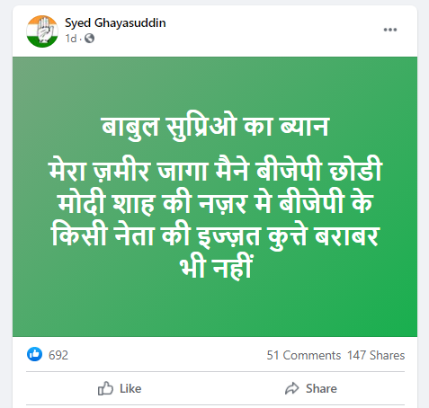 पश्चिम बंगाल में तीसरी बार ममता बनर्जी की सरकारी बनी है। गौरतलब है कि प्रदेश में बीजेपी को करारी हार का सामना करना पड़ा था। इसके बाद बीजेपी को बड़ा झटका तब लगा जब भाजपा के कई नेता पार्टी छोड़कर टीएमसी में शामिल हो गए। ऐसे में पूर्व केंद्रीय मंत्री बाबुल सुप्रियो (Babul Supriyo) ने शनिवार को अचानक पार्टी छोड़ने का ऐलान कर दिया था। उनके इस फैसले के बाद बीजेपी अध्यक्ष जेपी नड्डा ने सुप्रियो को अपने फैसले पर दोबारा विचार करने को कहा। जेपी नड्डा से मुलाकात के बाद सुप्रियो ने कहा कि वह सांसद बने रहेंगे, लेकिन राजनीति नहीं करेंगे। उन्होंने यह भी कहा कि वे किसी और पार्टी में नहीं जाएंगे। ऐसे में फेसबुक पर एक पोस्ट शेयर करते हुए दावा किया जा रहा है कि, बीजेपी छोड़ने का ऐलान करते वक्त बाबुल सुप्रियो ने कहा- “मेरा जमीर जागा और मैंने बीजेपी छोड़ी। पीएम मोदी और अमित शाह की नज़र में बीजेपी के किसी नेता की इज्ज़त कुत्ते के बराबर भी नहीं है।”
