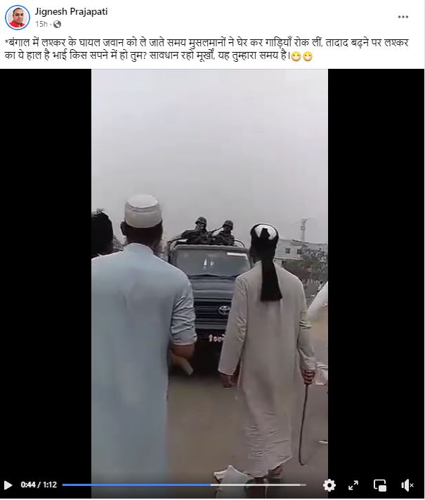 सोशल मीडिया पर एक वीडियो वायरल है, जिसमें कुछ हथियार बंद लोग एक वाहन को बीच सड़क पर रोकते हुए नज़र आ रहे हैं। वीडियो को शेयर कर इसे पश्चिम बंगाल का बताया जा रहा है। कहा जा रहा है कि बंगाल में एक घायल जवान को ले जाते समय मुसलमानों ने घेरकर गाड़ियां रोक लीं।
