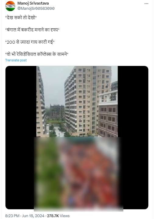 वायरल वीडियो को पश्चिम बंगाल का बताकर शेयर किया गया है, जिसमें लिखा हुआ है “देख सको तो देखो. बंगाल में बकरीद मनाने का दृश्य. 200 से ज्यादा गाय काटी गई. वो भी रेसिडेंसियल कॉप्लेक्स के सामने”.