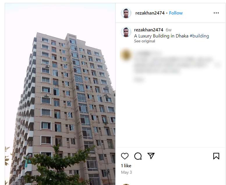 इसके बाद हमने कीफ्रेम की मदद से रिवर्स इमेज सर्च किया. इस प्रक्रिया में हमें एक इंस्टाग्राम अकाउंट से 3 मई 2024 को अपलोड किया गया एक वीडियो मिला, जिसमें वायरल वीडियो में दिख रही बिल्डिंग के दृश्य मौजूद हैं। कैप्शन में इस बिल्डिंग को बांग्लादेश की राजधानी ढाका का बताया गया है।