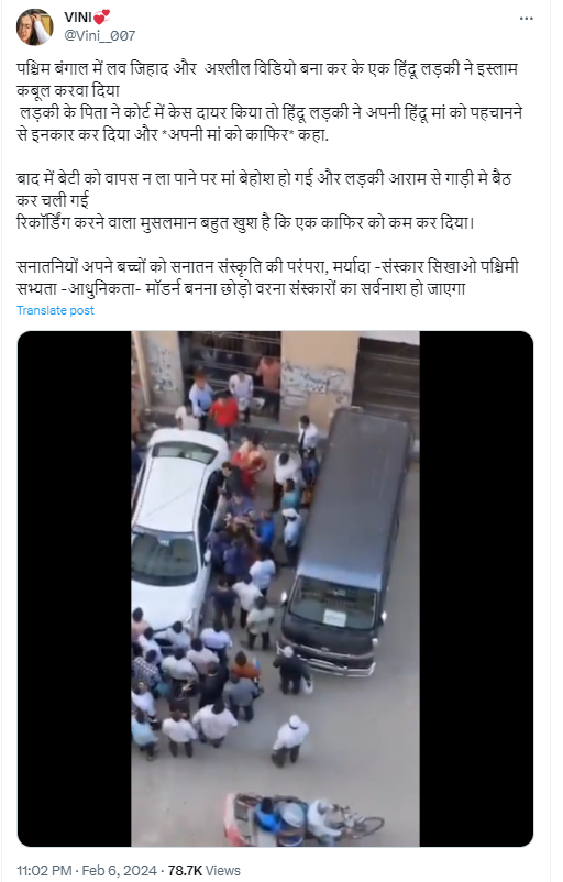 वीडियो को इस दावे के साथ शेयर किया गया है कि यह पश्चिम बंगाल का दृश्य है, जहां लव जिहाद और अश्लील वीडियो बनाकर एक हिंदू लड़की को मुस्लिम बना दिया गया. इस्लाम कबूल करने के बाद उसने अपनी मां को ही काफ़िर कह दिया और बेटी को वापस ना लाने पर मां बेहोश हो गई और लड़की आराम से गाड़ी में बैठकर चली गई.