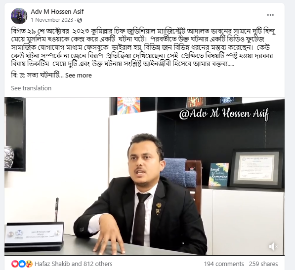 वीडियो के साथ मौजूद बांग्ला कैप्शन में दी गई जानकारी से यह प्रतीत हो रहा था कि इस वीडियो में वायरल वीडियो के बारे में ही जानकारी दी गई है. क्योंकि बांग्ला में मौजूद कैप्शन में लिखा है कि “29 अक्टूबर, 2023 को कूमिला मुख्य न्यायिक मजिस्ट्रेट न्यायालय भवन के सामने दो हिंदू लड़कियों के मुस्लिम बनने को लेकर एक घटना घटी. बाद में घटना का एक वीडियो फुटेज सोशल मीडिया फेसबुक पर वायरल हो गया और लोगों ने तरह-तरह की टिप्पणियाँ कीं. कुछ लोगों ने घटना के बारे में जाने बिना नकारात्मक प्रतिक्रिया व्यक्त की. उस संदर्भ में इस मामले को स्पष्ट करने की आवश्यकता है. इसलिए दोनों लड़कियों और घटना से जुड़े एक वकील के रूप में यह मेरा बयान है.”