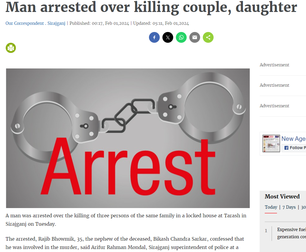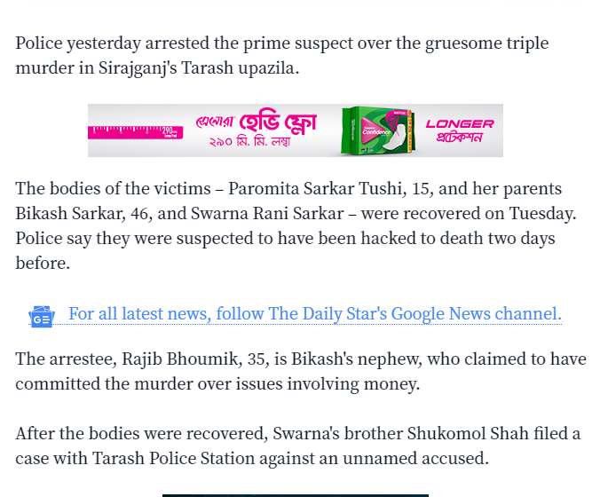 इस रिपोर्ट में बताया गया है कि सिराजगंज पुलिस ने 46 वर्षीय विकास सरकार, उनकी पत्नी स्वर्णा रानी सरकार एवं उनकी 15 वर्षीय बेटी की हत्या के आरोप में 35 वर्षीय राजीव भौमिक को गिरफ्तार किया है. राजीव भौमिक विकास सरकार का भांजा है.