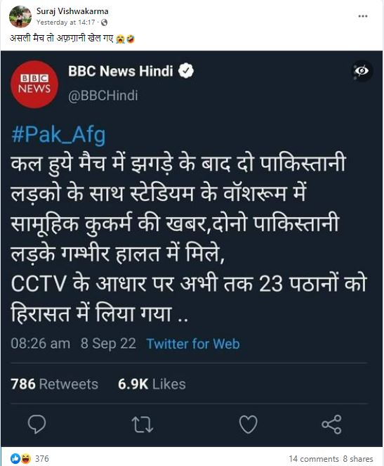 बीबीसी हिंदी के नाम से एक ट्वीट शेयर कर दावा किया गया है कि पाकिस्तान और अफगानिस्तान के मैच के बाद दो पाकिस्तानी लड़कों के साथ स्टेडियम के वॉशरूम में सामूहिक दुष्कर्म का मामला सामने आया है।