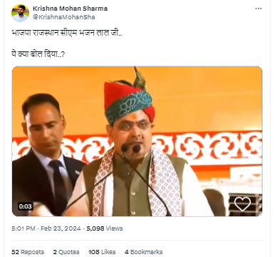 एक एक्स (पूर्व में ट्विटर) पोस्ट में राजस्थान के मुख्यमंत्री भजनलाल शर्मा के वीडियो क्लिप को शेयर करते हुए कैप्शन में लिखा गया है, ”भाजपा राजस्थान सीएम भजन लाल जी.. ये क्या बोल दिया?” इस वीडियो क्लिप में भजनलाल शर्मा माइक पर कहते दिख रहे हैं, ‘ये भारतीय जनता पार्टी का जुमला है, ये जुमले के आधार पर वोट मांगते हैं।’