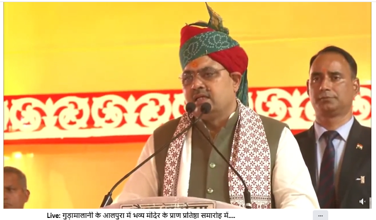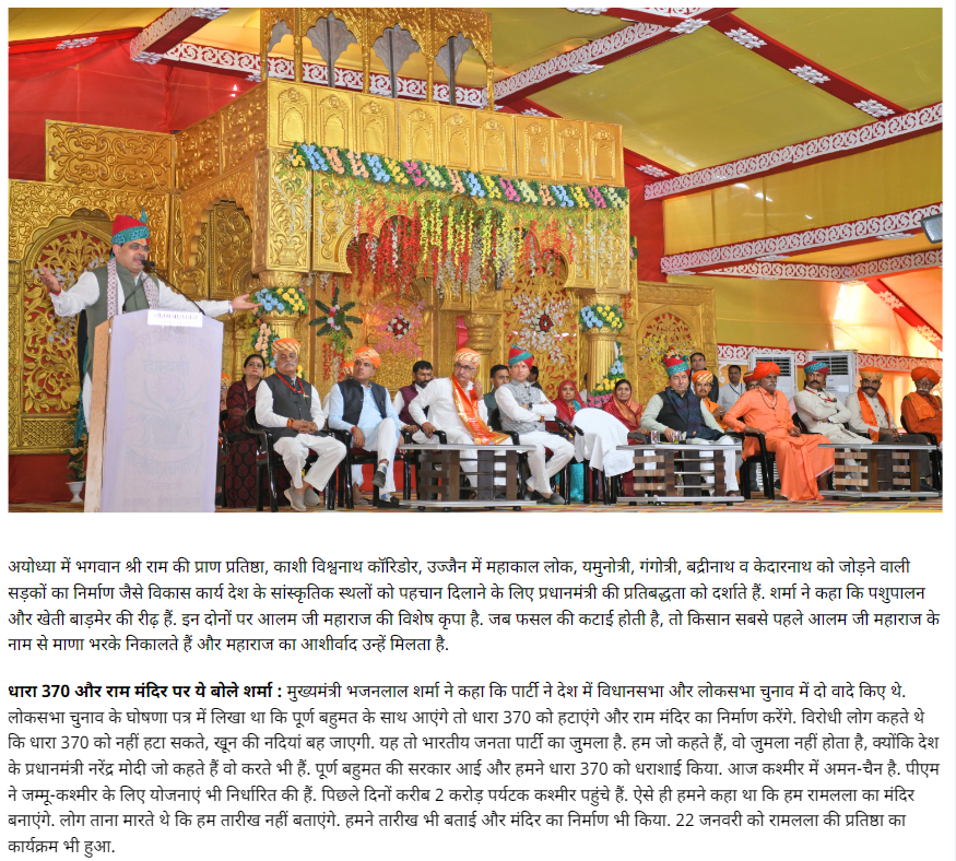 22 फरवरी 2024 को ETV भारत द्वारा प्रकाशित रिपोर्ट में बताया गया है कि इस संबोधन के दौरान मुख्यमंत्री ने कांग्रेस को जमकर आड़े हाथ लिया और मोदी सरकार की तारीफ की। रिपोर्ट में आगे बताया गया है कि मुख्यमंत्री भजनलाल शर्मा ने गुड़ामालानी में मंदिर के प्राण प्रतिष्ठा समारोह के दौरान कहा कि भाजपा ने देश में विधानसभा और लोकसभा चुनाव में दो वादे किए थे कि धारा 370 को हटाएंगे और राम मंदिर का निर्माण करेंगे। विरोधी लोगों ने इसे भारतीय जनता पार्टी का जुमला बताया था।”