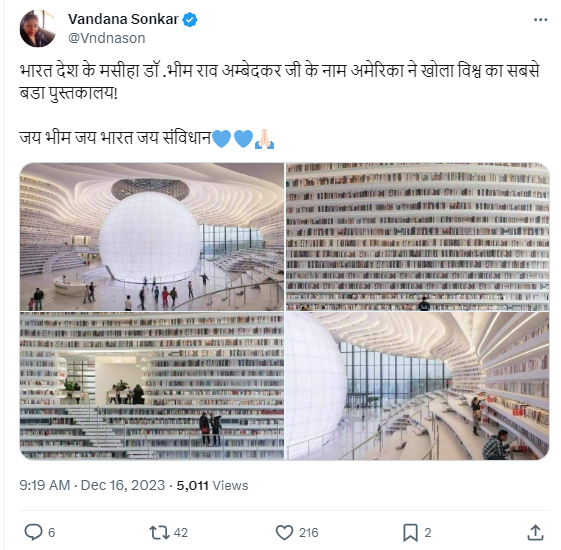हालांकि अपनी जांच में हमने पाया कि इन सोशल मीडिया पोस्ट में किया गया दावा फ़र्ज़ी है। इन पोस्ट्स के साथ डॉ भीमराव अम्बेडकर पुस्तकालय की बताकर साझा की गयी तस्वीरें असल में चीन देश के तिआनजिन बिन्हाई पुस्तकालय की हैं।