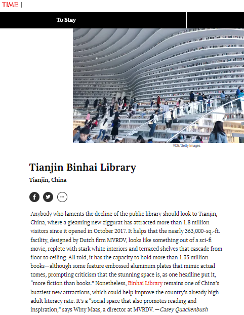 Newschecker ने पड़ताल की शुरुआत में दावे के साथ साझा की जा रहीं तस्वीरों को गूगल रिवर्स इमेज सर्च किया। हमने पाया कि यह तस्वीरें चीन के ‘तिआनजिन बिन्हाई पुस्तकालय’ की है। टाइम और आर्किटेक्ट न्यूज़ द्वारा प्रकाशित रिपोर्ट्स में दी गयी जानकारी से हमें पता चलता है कि बिन्हाई पुस्तकालय की स्थापना तिआनजिन बिन्हाई नगर पालिका द्वारा बीजिंग के बाहर एक तटीय महानगर तिआनजिन में बिन्हाई जिले के सांस्कृतिक केंद्र में की गई। बिन्हाई पुस्तकालय अक्टूबर 2017 में खुला था। इसे डच फर्म एमवीआरडीवी (MVRDV) द्वारा डिजाइन किया गया है। इस बेहद खूबसूरत पुस्तकालय में 1.35 मिलियन से अधिक किताबें रखने की क्षमता है, जो कि चीन के सबसे नए आकर्षणों में से एक बना हुआ है।