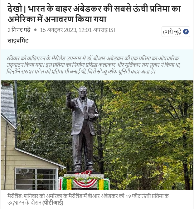 जब हमने अमेरिका में डॉ. भीमराव अम्बेडकर से जुड़ी खबर खोजी तब हमें मिंट द्वारा 15 अक्टूबर 2023 को प्रकाशित एक रिपोर्ट मिलती है। इसमें बताया गया है कि 14 अक्टूबर 2023 को अमेरिका में वाशिंगटन के मैरीलैंड में डॉ अंबेडकर की भारत के बाहर सबसे ऊंची प्रतिमा का अनावरण किया गया था।