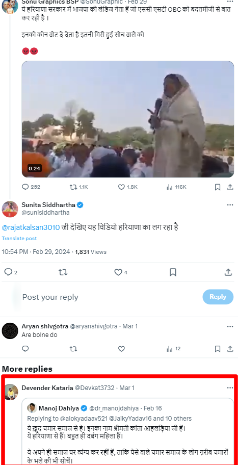 हरियाणा की भाजपा नेता द्वारा दलित समाज को लेकर आपत्तिजनक टिप्पणी किए जाने के नाम शेयर किए जा रहे इस दावे की पड़ताल के दौरान, हमने पाया कि एक यूजर ने वीडियो में दिख रहीं महिला को दलित समाज का बताते हुए यह दावा किया है कि वीडियो में वो दलित समाज के संपन्न लोगों को गरीब दलितों की मदद ना करने को लेकर व्यंग्य कर रही थीं.