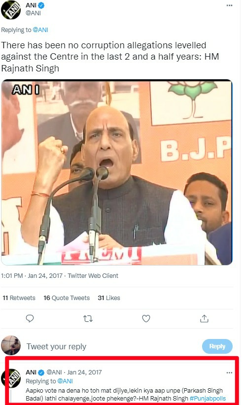 दावे की पड़ताल के दौरान कुछ कीवर्ड की मदद से ट्विटर पर सर्च करना शुरू किया। इस दौरान हमें समाचार एजेंसी ANI द्वारा 24 जनवरी 2017 को किया एक ट्वीट प्राप्त हुआ। ANI द्वारा किए गए ट्वीट के मुताबिक, केंद्रीय गृह मंत्री राजनाथ सिंह ने पंजाब के अबोहर में एक रैली को संबोधित करते हुए कहा, “आपको वोट नहीं देना है मत दीजिए, लेकिन क्या आप उन पर (प्रकाश सिंह बादल) लाठी चलाएंगे, जूते फेकेंगे?”