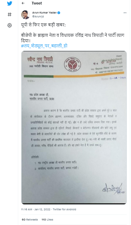 RJD के प्रवक्ता Arun Kumar Yadav ने वायरल पोस्ट शेयर कर लिखा, ”यूपी से फिर एक बड़ी खबर: बीजेपी के ब्राह्मण नेता व विधायक रविंद्र नाथ त्रिपाठी ने पार्टी त्याग दिया।