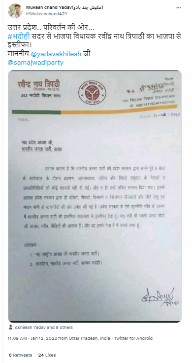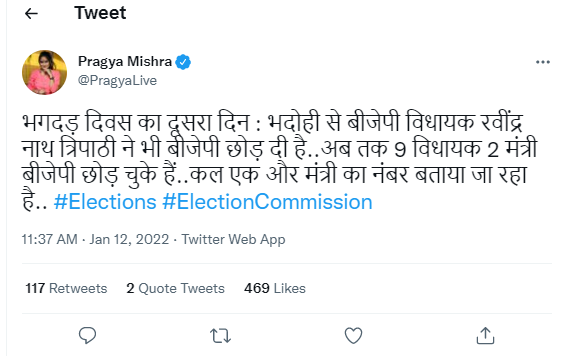 PRAGYA MISHRA ने वायरल पोस्ट को ट्वीट करते हुए लिखा, “भगदड़ दिवस का दूसरा दिन : भदोही से बीजेपी विधायक रवींद्र नाथ त्रिपाठी ने भी बीजेपी छोड़ दी है..अब तक 9 विधायक 2 मंत्री बीजेपी छोड़ चुके हैं..कल एक और मंत्री का नंबर बताया जा रहा है..”