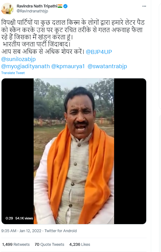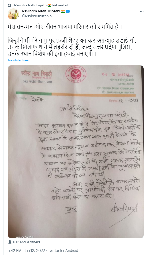 हमने अपनी पड़ताल में पाया कि रविंद्र नाथ त्रिपाठी ने 12 जनवरी 2022 को अपना लेटर पैड ट्वीट करते हुए इस्तीफा संबंधित दावे का खंडन किया। उन्होने अपने लेटर पैड के साथ ट्वीट करते हुए लिखा, “मेरा तन-मन और जीवन भाजपा परिवार को समर्पित हैं। जिन्होंने भी मेरे नाम पर फ़र्जी लेटर बनाकर अफ़वाह उड़ाई थी, उनके खिलाफ थाने में तहरीर दी हैं, जल्द उत्तर प्रदेश पुलिस, उनके स्थान विशेष की हवा हवाई बनाएगी।”