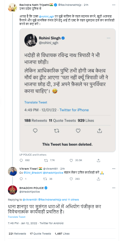 हमने अपनी पड़ताल में पाया कि विधायक रविंद्र नाथ त्रिपाठी ने 12 जनवरी 2022 को शाम 6 बजकर 47 मिनट पर ट्वीट करते हुए अपने इस्तीफे से जुड़ी अफवाह फैलाने पर पत्रकार रोहिणी सिंह पर एफआईआर करने की मांग की है। उन्होंने ट्वीट किया, “उत्तर प्रदेश पुलिस से आग्रह है कि उक्त @rohini_sgh पर मुझे साज़िश के तहत बदनाम करने, झूठी अफ़वाह फैलाने और मुझे मानसिक तनाव देने हेतु आई टी एक्ट के तहत मुकदमा दर्ज कर कार्यवाही करने का कष्ट करें।”