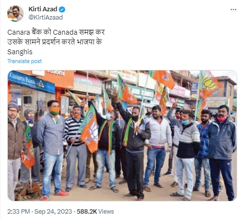 तृणमूल कांग्रेस के नेता कीर्ति आज़ाद ने वायरल तस्वीर को अपने वेरिफ़ाईड X अकाउंट से शेयर करते हुए कैप्शन में लिखा है, “Canara बैंक को Canada समझ कर उसके सामने प्रदर्शन करते भाजपा के Sanghis”.