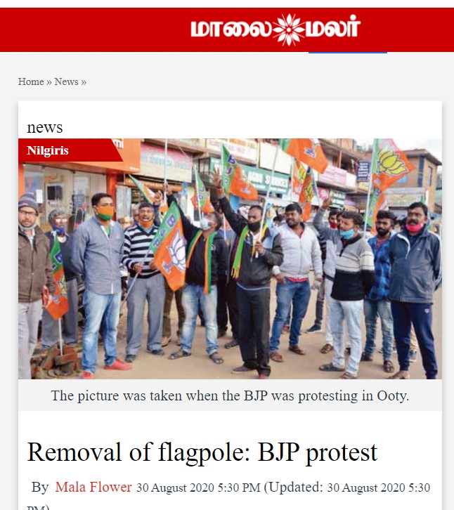 तमिल भाषा में प्रकाशित रिपोर्ट के अनुसार, तमिलनाडु के नीलगिरी जिले के ऊटी में कुछ भाजपा कार्यकर्ताओं ने कथित तौर पर अधिकारियों की अनुमति लिए बिना नगर पालिका की जमीन पर पार्टी का झंडा लगाने के लिए ध्वज स्तंभ का निर्माण किया था. बाद में नगर पालिका के कर्मचारियों और पुलिस ने इस ध्वजस्तंभ को हटा दिया था. इसके बाद भाजपा नेताओं ने ऊटी शहर अध्यक्ष प्रवीण के नेतृत्व में एटीसी इलाक़े में प्रदर्शन किया था. रिपोर्ट में भाजपा नेता प्रवीण का बयान भी मौजूद है.