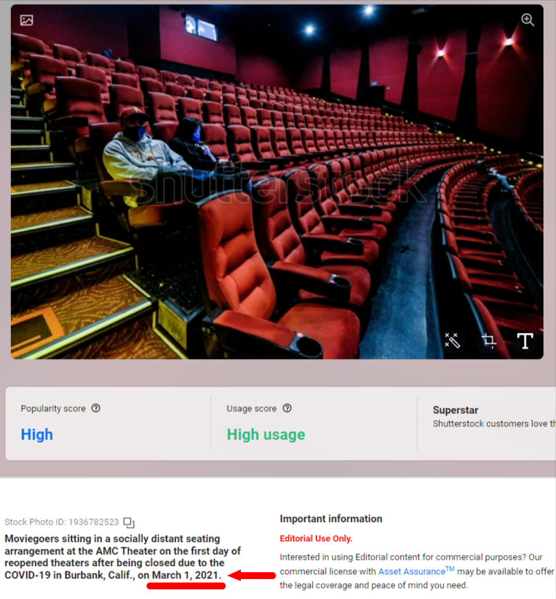 Shutterstock द्वारा दूसरी तस्वीर के विवरण में यह जानकारी दी गई है कि यह तस्वीर California के Burbank स्थित AMC Theater की है जहां 1 मार्च, 2021 को कोरोना संक्रमण के मामलों में कमी आने के बाद थिएटर लंबे अंतराल के बाद खुला था.