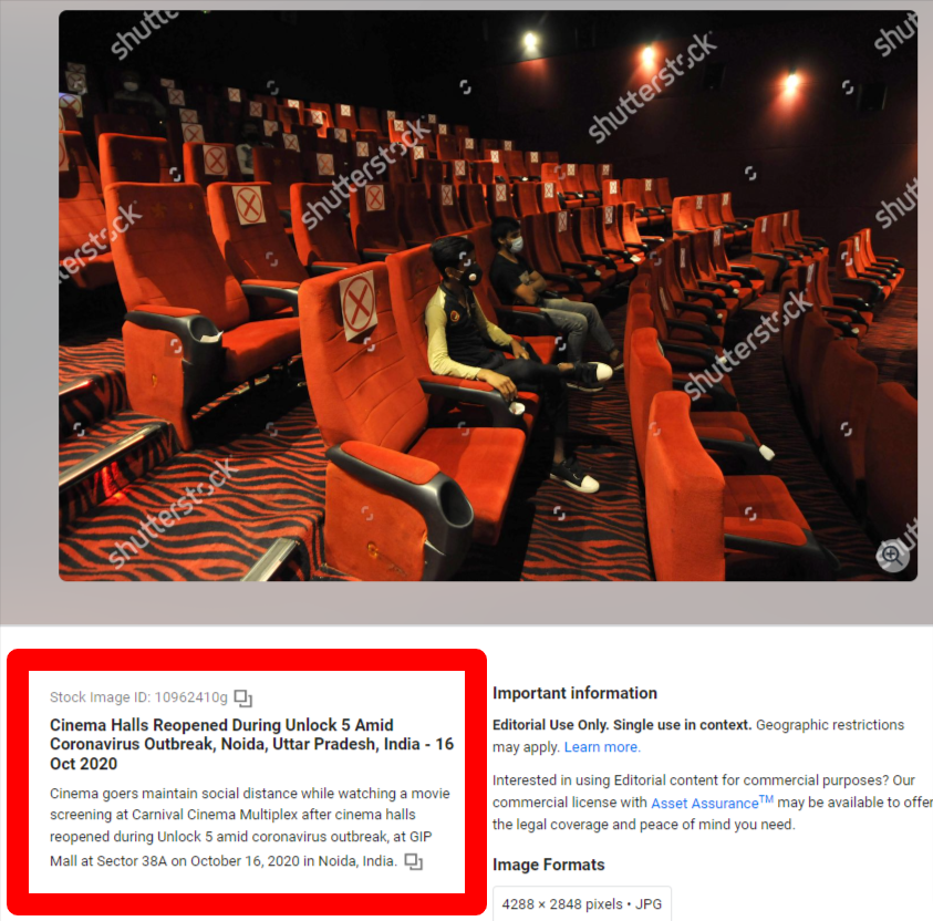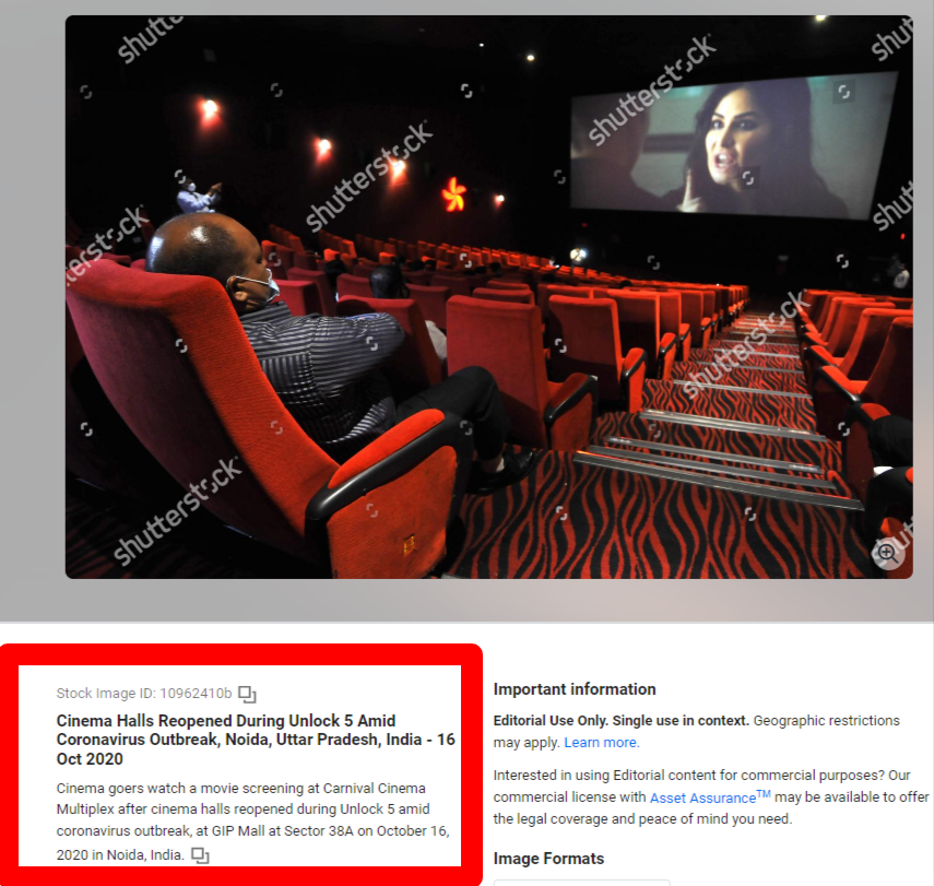 Shutterstock तथा Getty Images द्वारा प्रकाशित लेखों के अनुसार यह तस्वीर नोएडा स्थित कार्निवाल सिनेमा मल्टीप्लेक्स की है, जो 16 अक्टूबर, 2020 को ली गई थी.