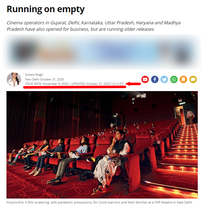 Getty Images तथा Shutterstock प्रकाशित लेखों के अनुसार यह तस्वीर 16 अक्टूबर, 2020 को नोएडा स्थित कार्निवाल सिनेमा मल्टीप्लेक्स को फिल्म देखने पहुंचे दर्शकों की है.