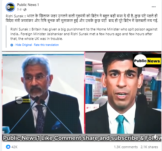 13 नवंबर को ‘पब्लिक न्यूज़ 1’ नामक फेसबुक पेज ने गृह मंत्री सुएला ब्रेवरमैन बर्खास्त होने की ख़बर साझा करी। इस वीडियो में उन्होंने दावा किया कि सुएला ब्रेवरमैन को उनके पद से भारत के इशारे पर हटाया गया है। इन्होंने अपनी पोस्ट की कैप्शन में लिखा है कि ‘भारत के खिलाफ जहर उगलने वाली गृहमंत्री को ब्रिटेन ने बहुत बड़ी सजा दे दी है। कुछ घंटे पहले ही विदेश मंत्री एस.जयशंकर और ऋषि सुनक की मुलाकात हुई और उसके कुछ घंटों बाद ही पूरे ब्रिटेन में खलबली मच गई।’
