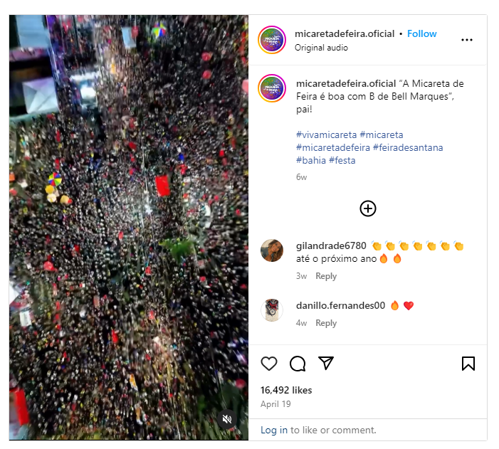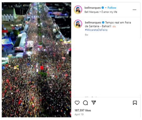 सोशल वीडियो पर अखिलेश यादव की चुनाव प्रचार रैली का बताकर वायरल वीडियो में एक लंबी सड़क दूर तक भारी भीड़ से भरी नज़र आ रही है। इस दावे की पड़ताल के लिए सबसे पहले हमने वीडियो के की-फ्रेम्स को गूगल रिवर्स इमेज सर्च किया। इस दौरान हमें ब्राजिलियाई सिंगर बेल मार्क्यूस के इंस्टाग्राम अकाउंट से 19 अप्रैल 2024 को शेयर किए गए पोस्ट में यह वीडियो नज़र आया। कैप्शन में इसे ब्राजील के बाहिया का बताया गया है और साथ में #MicaretaDeFeira लिखा गया है।