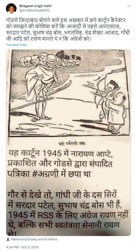 वायरल तस्वीर को देखने पर पता चलता है कि इसमें सिर्फ कार्टून ही नहीं है बल्कि तस्वीर पर गोडसे और आरएसएस को लेकर दावे किये गए हैं। तस्वीर में लिखा है कि “यह कार्टून 1945 में नारायण आप्टे, प्रकाशित और गोडसे द्वारा सम्पादित पत्रिका अग्रणी में छपा था। गौर से देखे तो गांधी जी के दस सिरों में सरदार पटेल और सुभाष चंद्र बोस भी हैं। साल 1945 में RSS के लिए अंग्रेज रावण नहीं थे बल्कि सभी स्वतंत्रता सेनानी रावण थे। हमने यह जानने का प्रयास किया कि ‘अग्रणी’ नामक इस पत्रिका का सच क्या है। इसी क्रम में हमें नाथूराम गोडसे के द्वारा संपादित ‘अग्रणी’ के विवरण वाले कुछ लेख मिलें। NDTV में छपा यह लेख यह बताता है कि कैसे नाथूराम गोडसे ने ‘अग्रणी’ बंद होने के बाद ‘हिन्दू राष्ट्र’ के नाम पर एक नया समाचार पत्र प्रकाशित किया तो वहीं पत्रिका में छपे इस लेख में भी ‘अग्रणी’ नामक इस पत्रिका से संबंधित जानकारी दी गई है। Indian Express में प्रकाशित लेख के माध्यम से भी इस विषय पर अधिक जानकारी प्राप्त की जा सकती है।