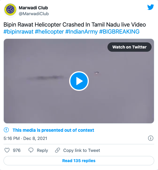 ऐसे ही हेलीकॉप्टर हादसे का एक वीडियो शेयर कर उसे भारतीय वायुसेना का बताया जा रहा है जिसमें CDS बिपिन रावत सवार थे।