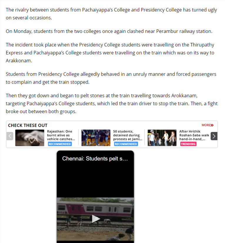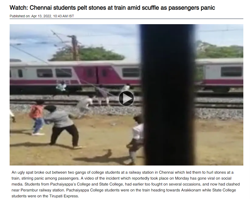 ETV Bharat द्वारा 13 अप्रैल, 2022 को प्रकाशित लेख के अनुसार चेन्नई स्थित पेरम्बूर स्टेशन के पास चेन्नई के दो कॉलेज के छात्रों की आपसी लड़ाई में ट्रेन पर पत्थरबाजी की गई. लेख के अनुसार Pachaiyappa’s College और State College (Presidency College) के छात्रों के बीच पूर्व में भी कई बार आपसी झड़प हो चुकी है.