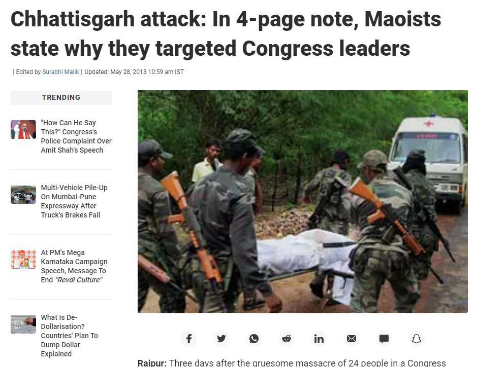 दावे की सत्यता जानने के लिए हमने तस्वीर को रिवर्स सर्च किया। हमें NDTV की वेबसाइट पर साल 2013 में प्रकाशित एक रिपोर्ट मिली। इसमें वायरल तस्वीर मौजूद है। रिपोर्ट में बताया गया है कि छत्तीसगढ़ में हुए माओवादी हमले में 24 लोगों की मौत हो गई थी। इससे ये साफ है कि तस्वीर कम से कम 10 साल पहले से इंटरनेट पर मौजूद है।