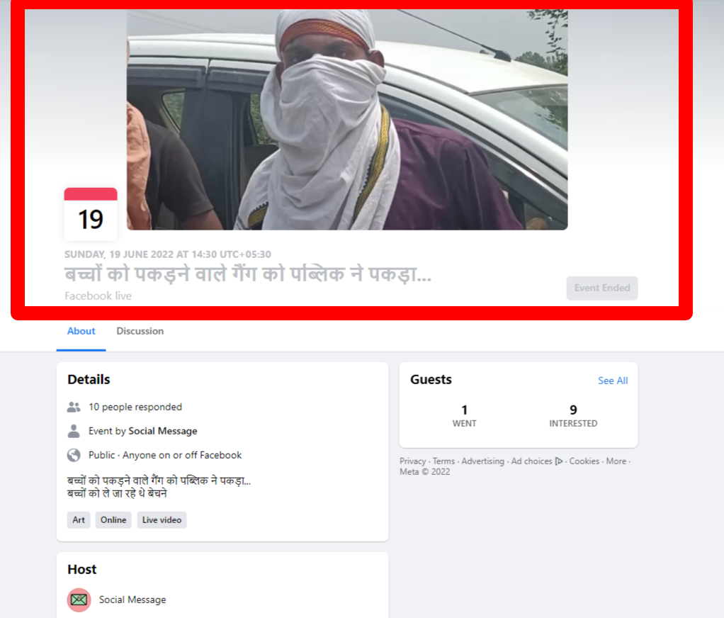 कुछ कीवर्ड्स की सहायता से सर्च करने पर हमें यह जानकारी मिली कि Social Message नामक उक्त पेज ने या तो यह पोस्ट डिलीट कर दिया है या इसकी प्राइवेसी बदल दी है. हालांकि, हमें पेज द्वारा आयोजित एक इवेंट में वायरल वीडियो का एक दृश्य तथा इससे संबंधित इवेंट डिस्क्रिप्शन प्राप्त हुआ. बता दें कि Social Message जागरूकता फैलाने तथा मनोरंजन के उद्देश्य से ऐसे ही स्क्रिप्टेड वीडियो बनाता रहता है.