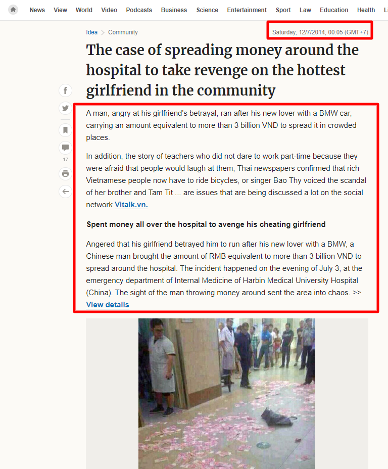 VnExpress द्वारा 12 जुलाई, 2014 को प्रकाशित एक लेख का अंग्रेजी अनुवाद करने पर भी हमें यही जानकारी मिली कि चीन में एक व्यक्ति ने अपनी प्रेमिका के धोखे से आहत होकर नोटों को जमीन पर फेंक दिया.