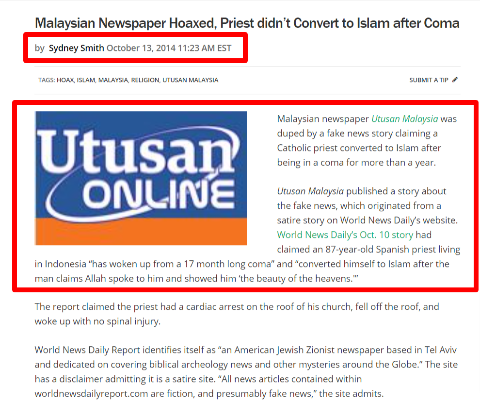 iMediaEthics द्वारा 13 अक्टूबर 2014 को प्रकाशित एक लेख के अनुसार, यह खबर मलेशियाई न्यूज़पेपर Utusan Malaysia द्वारा प्रकाशित की गई थी. संस्था ने यह खबर World News Daily Report नामक एक हास्य वेबसाइट द्वारा प्रकाशित लेख के आधार पर प्रसारित किया था.