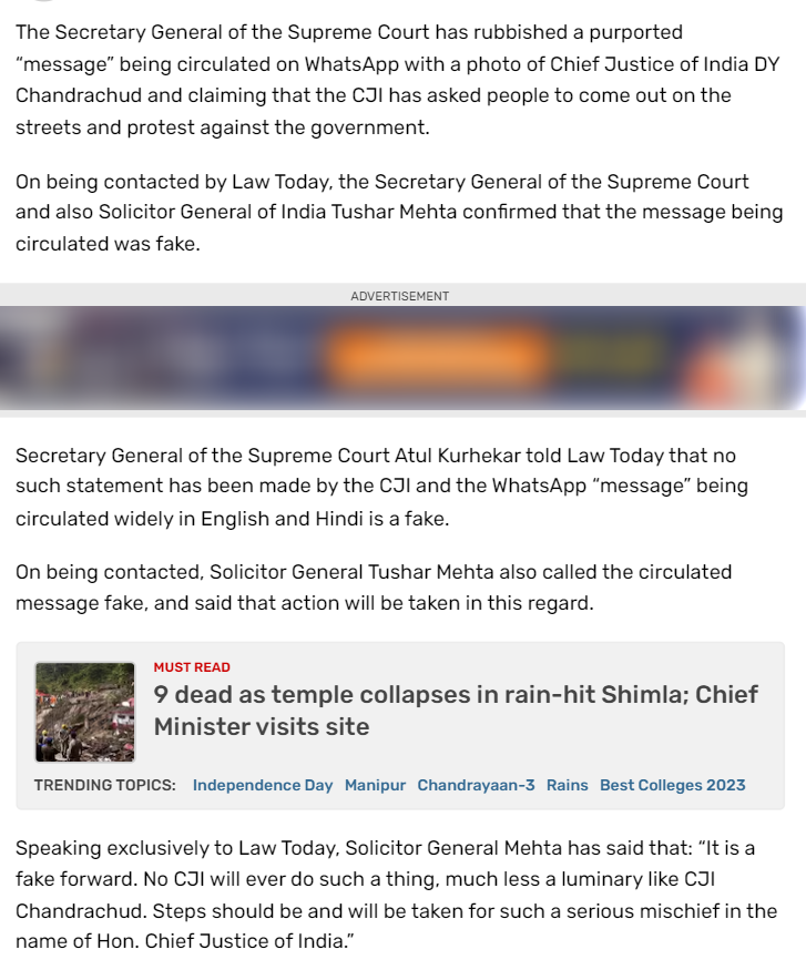 इसके अतिरिक्त, India Today द्वारा 14 अगस्त, 2023 को प्रकाशित एक लेख के अनुसार सुप्रीम कोर्ट के सेक्रेटरी जनरल अतुल कुरहेकर और सॉलिसिटर जनरल तुषार मेहता ने भी इस दावे को गलत बताया है.