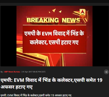 दावे की पड़ताल के लिए सबसे पहले हमने वीडियो के की-फ्रेम को रिवर्स इमेज सर्च किया। इसके परिणाम में हमें ABP न्यूज़ द्वारा 1 अप्रैल 2017 को “एमपी: EVM विवाद में भिंड के कलेक्टर, एसपी समेत 19 अफसर हटाए गए” हेडलाइन के साथ प्रकाशित की गयी वीडियो रिपोर्ट मिली। 10 मिनट 32 सेकंड की इस रिपोर्ट में वायरल हुआ वीडियो मौजूद है। बतौर रिपोर्ट, यह वीडियो मध्य प्रदेश का है, जहां अटेर में विधानसभा उप-चुनाव से पूर्व हुए EVM विवाद में भिंड के कलेक्टर, एसपी समेत 19 अधिकारी हटाए गए थे।