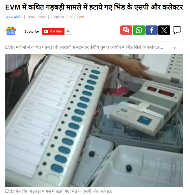 1 अप्रैल 2017 को आजतक द्वारा प्रकाशित रिपोर्ट के अनुसार, यह वीडियो साल 2017 का है। तब मध्य प्रदेश के भिंड जिले की अटेर विधानसभा में हुए उपचुनाव के पहले EVM परीक्षण के दौरान EVM में गड़बड़ी पायी गयी थी। भिंड ज़िले में विधानसभा उपचुनाव की तैयारियों का जायजा लेने पहुंचीं मुख्य निर्वाचन अधिकारी सलीना सिंह ने जब वोटर वेरीफाइड पेपर ऑडिट ट्रायल के डेमो के लिए दो अलग-अलग बटन दबाए, तो दोनों बार कमल के फूल की पर्ची निकली। आम आदमी पार्टी और कांग्रेस ने इस मामले को लेकर चुनाव आयोग में शिकायत की थी। इसके बाद चुनाव आयोग ने जिला मतदान अधिकारी से पूरे मामले की रिपोर्ट तलब की थी। EVM में गड़बड़ी के मामले को लेकर चुनाव आयोग ने भिंड के SP और DM को हटा दिया था। इसी शिकायत पर कार्रवाई करते हुए आयोग ने 19 अफसरों को चुनाव कार्य से हटा दिया था।