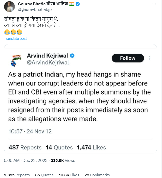 अरविंद केजरीवाल का यह ट्वीट अंग्रेज़ी में है, जिसका हिंदी अनुवाद है “एक देशभक्त भारतीय होने के नाते मेरा सिर तब शर्म से झुक जाता है जब हमारे भ्रष्ट नेता जांच एजेंसियों के बार-बार समन भेजने के बाद भी ED और CBI के सामने पेश नहीं होते हैं, जबकि आरोप लगते ही उन्हें तुरंत अपने पद से इस्तीफा दे देना चाहिए”. स्क्रीनशॉट में दी गई जानकरी के अनुसार, अरविंद केजरीवाल ने यह ट्वीट 24 नवंबर 2012 को 10 बजकर 57 मिनट पर किया है.