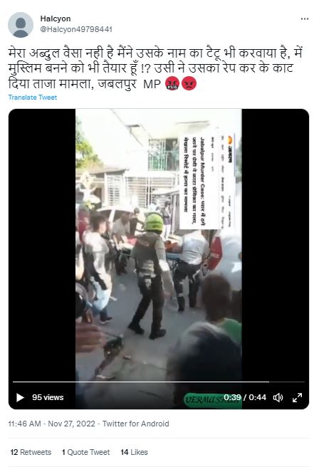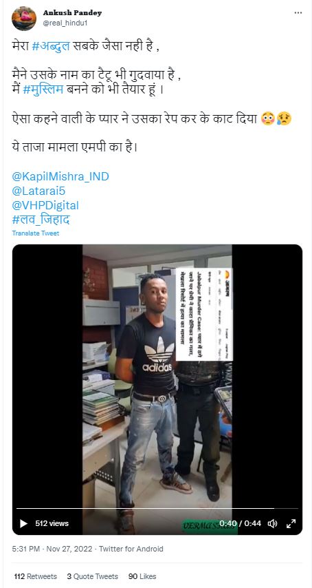 मुंबई की श्रद्धा वॉकर हत्याकांड के बाद से सोशल मीडिया पर कई वीडियो सांप्रदायिक दावे के साथ शेयर किए जा रहे हैं। इसी कड़ी में एक वीडियो वायरल है, जिसमें एक लड़की के शरीर पर चोट के निशान नजर आ रहे हैं, साथ ही वीडियो में एक लड़के को पुलिस गिरफ्तार करके ले जा रही है। वीडियो को सांप्रदायिक रंग देकर दावा किया जा रहा कि यह घटना मध्य प्रदेश के जबलपुर की है।