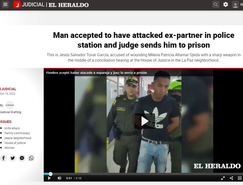 इसकी मदद लेते हुए हमने कुछ कीवर्ड्स को गूगल सर्च किया। हमें एक स्पैनिश मीडिया वेबसाइट El Haraldo पर 16 नवंबर 2022 को छपी एक रिपोर्ट मिली। बतौर रिपोर्ट, कोलंबिया के बैरेंक्विला शहर में Jesús Salvador Tovar नामक एक व्यक्ति को अपनी पूर्व पार्टनर Sandra Milena Altamar Ojeda पर चाकू से वार करने के आरोप में गिरफ्तार कर लिया गया। यह घटना उस वक्त हुई जब La Paz जिले की अदालत में सुनवाई चल रही थी।