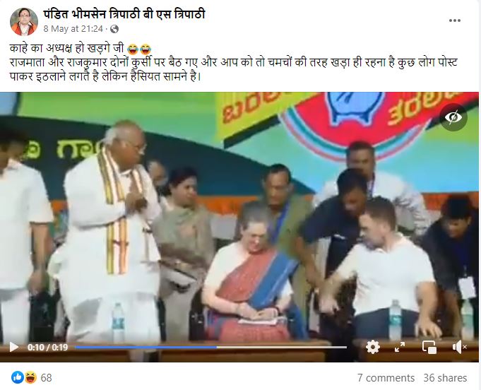 सोशल मीडिया पर एक वीडियो वायरल है जिसमें कांग्रेस अध्यक्ष मल्लिकार्जुन खड़गे मंच पर खड़े नज़र आ रहे हैं, जबकि उनके बगल में सोनिया गांधी और राहुल गांधी बैठे हुए हैं। दावा किया जा रहा है कि कांग्रेस अध्यक्ष होने के बावजूद मल्लिकार्जुन खड़गे को बैठने के लिए सोनिया गांधी की मंजूरी का इंतजार करते देखा गया।
