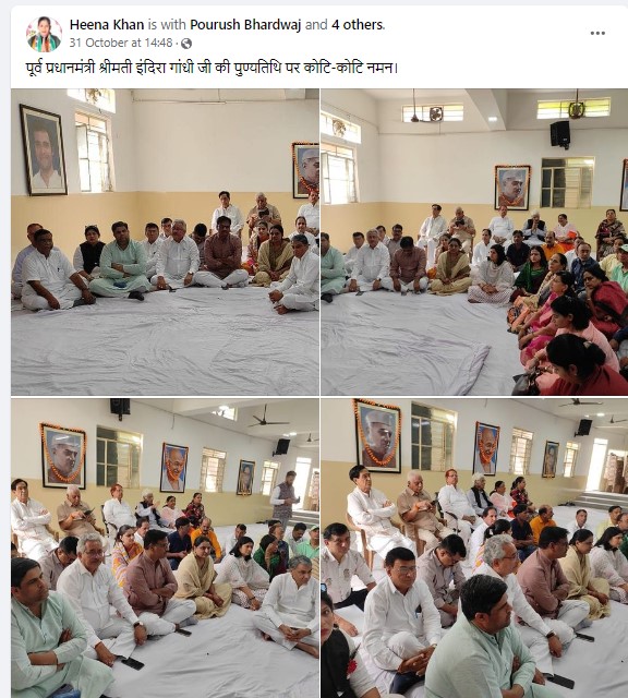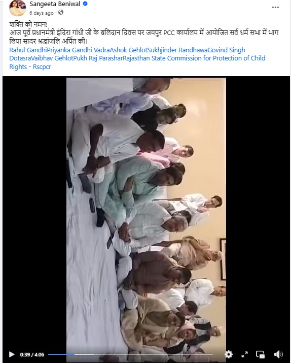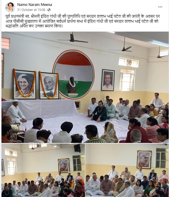 फ़ेसबुक पोस्ट में मौजूद कैप्शन में बताया गया था कि जयपुर के प्रदेश कांग्रेस कार्यालय में पूर्व प्रधानमंत्री इंदिरा गांधी और पूर्व उप प्रधानमंत्री सरदार वल्लभ भाई पटेल की जयंती पर सर्वधर्म प्रार्थना सभा आयोजित कर श्रद्धांजलि अर्पित की गई थी.