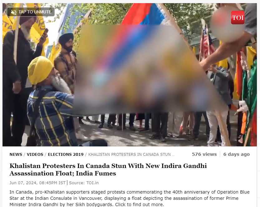 दैनिक भास्कर द्वारा प्रकाशित रिपोर्ट में बताया गया है कि किस प्रकार ऑपरेशन ब्लू स्टार की 40 वीं बरसी पर 6 जून को कनाडा के अलग-अलग शहरों में ऑपरेशन ब्लू स्टार के खिलाफ प्रदर्शन हुए। वैंकूवर में हुए प्रदर्शन में इंदिरा गांधी के छलनी किये गए पुतले के साथ झांकी निकाली गयी। इसमें इंदिरा गाँधी के हत्यारे बेअंत सिंह और सतवंत सिंह को इंदिरा गांधी पर बंदूक ताने दिखाया गया। इस दौरान प्रदर्शनकरियों ने खालिस्तान के झंडे लहराए और भारत विरोधी नारे लगाते हुए संविधान की प्रतियां और तिरंगा जलाया।