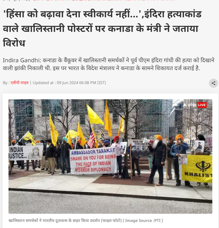 दावे की पड़ताल के लिए हमने वीडियो के की-फ्रेम्स को गूगल रिवर्स इमेज सर्च किया। इस दौरान हमें इस वीडियो के संबंध में प्रकशित हुई कई मीडिया रिपोर्ट्स मिलीं। 7 जून 2024 को टाइम्स ऑफ़ इंडिया द्वारा प्रकाशित रिपोर्ट के अनुसार, 6 जून 2024 की यह घटना कनाडा के वेंकूवर शहर की है। यह प्रदर्शन कनाडा में भारतीय दूतावास के बाहर ऑपरेशन ब्लू स्टार के 40 वर्ष होने पर किया गया था।